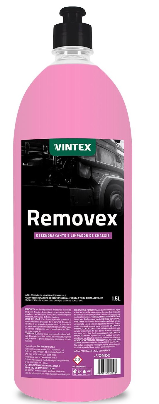 REMOVEX é UM DESENGRAXANTE E LIMPADOR DE CHASSIS DE ALTO PODER DE AçãO, DESENVOLVIDO PARA REMOVER SUJEIRAS PESADAS COMO óLEO, GRAXA, BARRO, LAMA, MATéRIA ORGâNICA DE CHASSIS, CARROCERIAS DE FERRO E MADEIRA.